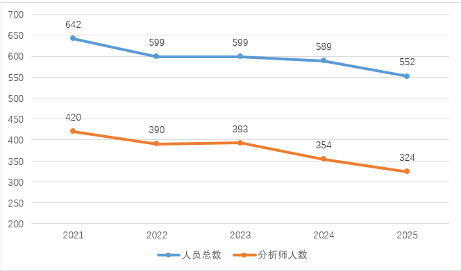 聯(lián)合資信倡導(dǎo)以人為本的企業(yè)文化,吸引了大批有識之士的加盟,近5年來,公司人員數(shù)量穩(wěn)定發(fā)展。截止2025年底,公司擁有分析師324人,占公司總?cè)藬?shù)的59%。